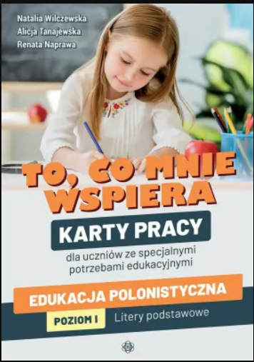 „To, co mnie wspiera” to zestaw kart pracy przeznaczonych dla uczniów ze specjalnymi potrzebami edukacyjnymi. Prezentowana publikacja obejmuje treści z zakresu edukacji polonistycznej, dotyczące utrwalenia znajomości liter podstawowych i nauki polskich znaków. Zadania zawarte w kartach pracy pomogą uczniom osiągnąć między innymi takie umiejętności jak: rozpoznawanie oraz nazywanie podstawowych liter drukowanych i pisanych; rozpoznawanie oraz nazywanie drukowanych i pisanych liter z polskimi znakami, dwuznaków i trójznaku; pisanie liter samodzielnie i po śladzie; rozpoznawanie liter ukrytych na obrazkach; czytanie sylab otwartych i zamkniętych; czytanie i tworzenie podpisów pod zdjęciami; czytanie wyrazów z poznanymi literami metodą sylabową i całościowo.