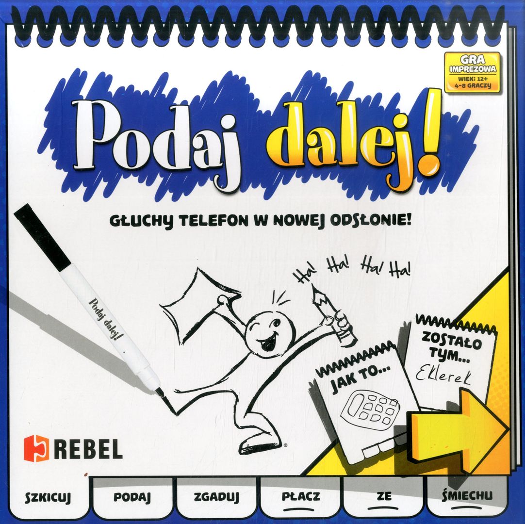 ”Podaj Dalej!” nie jest zwykłą grą imprezową, to świetna zabawa w najczystszej postaci! Każdy z graczy będzie musiał zarówno popisać się fantazją i wyobraźnią, rysując wylosowane hasło, jak i odgadnąć co narysowali inni gracze. Chwyć za szkicownik - rysuj, zgaduj i Podaj Dalej! Podaj dalej! to rysowany głuchy telefon, jeśli pierwszy i ostatni obrazek w szkicowniku się zgadzają to znaczy, że gracze prawidłowo odgadywali hasła. Jeśli nie? No cóż - wtedy na pewno do łez rozbawi was ciąg myślowy i prześmieszne rysunki stworzone przez graczy pod presją czasu. W efekcie waszych starań powstanie w każdym szkicowniku ciąg skojarzeń kolejnych osób. (opis wydawcy).