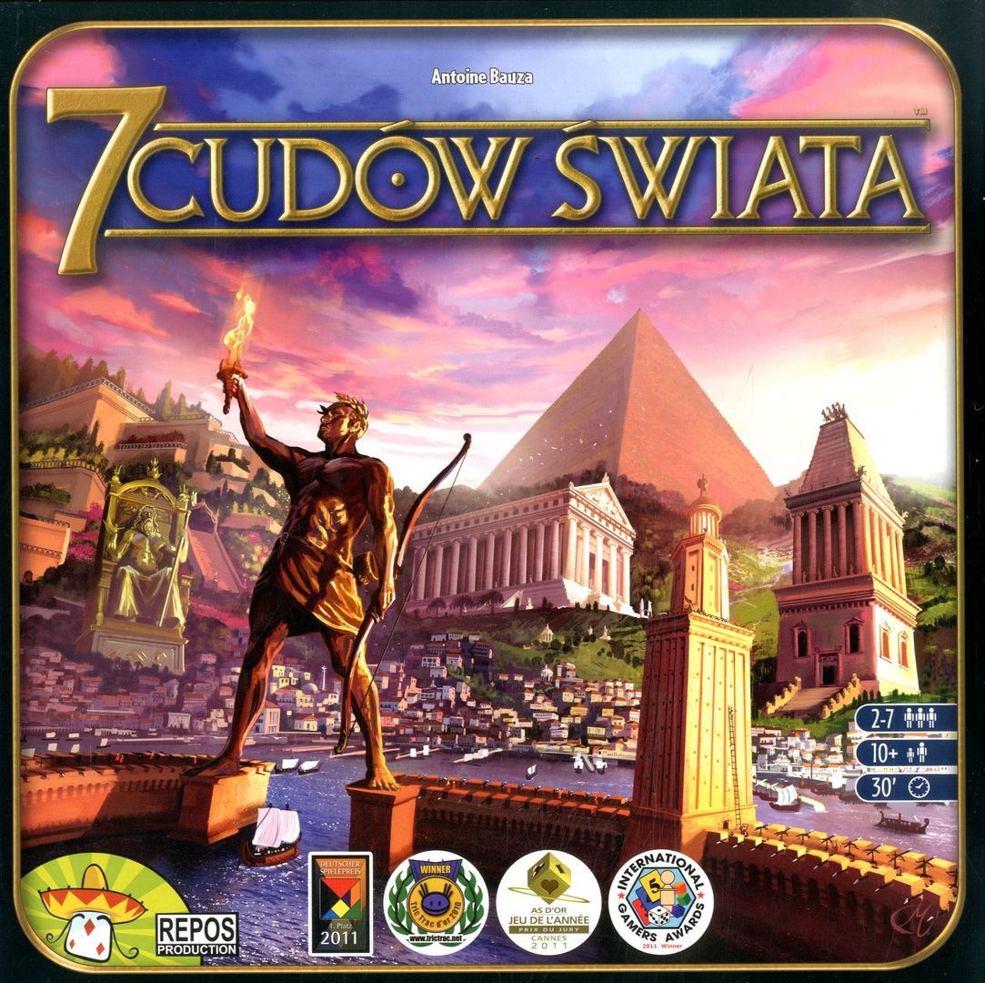 Zostań przywódcą jednego z siedmiu wielkich miast świata antycznego. Zbieraj surowce ze swoich ziem, weź udział w odwiecznym wyścigu cywilizacyjnym, nawiąż kontakty handlowe i stwórz militarną potęgę. Pozostaw ślad na kartach historii budując cud architektury, który przetrwa wieki! 7 cudów świata to świetnie zbalansowana gra o rozwoju cywilizacji, która łączy proste zasady i dynamiczną rozgrywkę z planowaniem i strategicznym myśleniem. Uczestnicy wcielają się w przywódców starożytnych miast, które starają się poprowadzić do jak najbardziej optymalnego rozwoju. [aleplanszowki.pl].