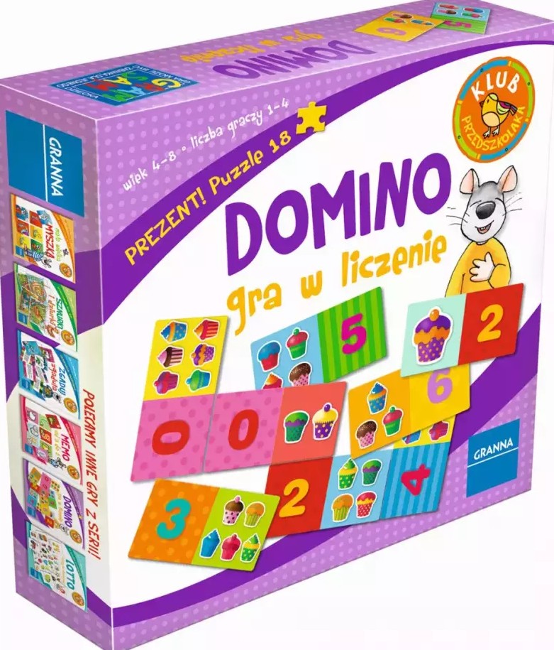 Domino gra w liczenie : zabawka edukacyjna - Warszawa : Granna, 2015. - 1gra (elementy domina - 28 sztuk, żetony - 40 sztuk, instrukcja) : karton, tektura, metal, plastik, kolor ; w pudełku 19x20x5 cm.