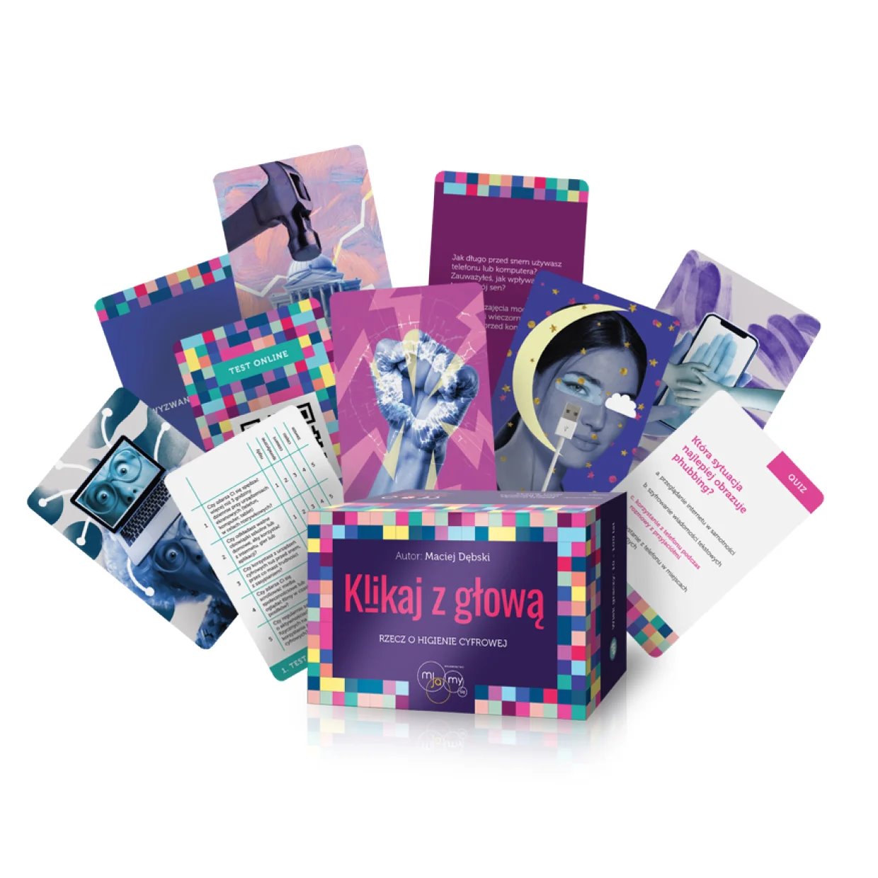 Gra "Klikaj z głową" to nowoczesne narządzie wspierające, specjalistów w prowadzeniu rozmów na temat zdrowego korzystania z nowych technologii, mediów społecznościowych i Internetu. Gra prowokuje do refleksji, uczy świadomych wyborów i wspiera budowanie cyfrowej higieny. Idealna do pracy indywidualnej i grupowej. Co wchodzi w skład gry? Test – Skala Higieny Cyfrowej (5–stopniowa) – pierwszy krok, który pozwoli lepiej zrozumieć nawyki dotyczące korzystania z Internetu. Karty metaforyczne – 20 pięknych obrazów wraz z cytatami, które uruchamiają refleksje i emocje. Quiz Harmonia Cyfrowa – 60 pytań o różnym poziomie trudności, wzbogacających wiedzę z zakresu higieny cyfrowej. Karty tematyczne - 60 pytań, które otwierają przestrzeń do refleksji i rozmowy na temat najważniejszych aspektów życia w świecie cyfrowym i jego wpływu na nasze zdrowie fizyczne i psychiczne. Karty wyzwań do pracy w grupie – 110 zadań Gra jest tak skonstruowane, że przeplatają się w niej elementy autoreflekscji i twardej wiedzy dotyczącej zjawisk zagrażających użytkownikom Internetu. Uczestnicy również otrzymują praktyczne zadania związane z bezpieczeństwem cyfrowym. Dzięki takiej konstrukcji wiedza od razu jest powiązana z analizą własnych zachowań jak i z doświadczeniam ich wykorzystania, co pozytywnie wpływa na zmianę zachowań uczestników. Grę można wykoszystać jako całość, rozpoczynając lub korzystać z jej elementów. W instrukcji podanych jest też kilka propozycji rozgrywek. Zależnie od możliwości czasowych, narzędzie można wykorzystać jako krótką, 20 minutową pracę, a można nie niej oprzeć całodniowe szkolenie uzupełniając poszczególne etapy teorią czy treściami uzupełniającymi.