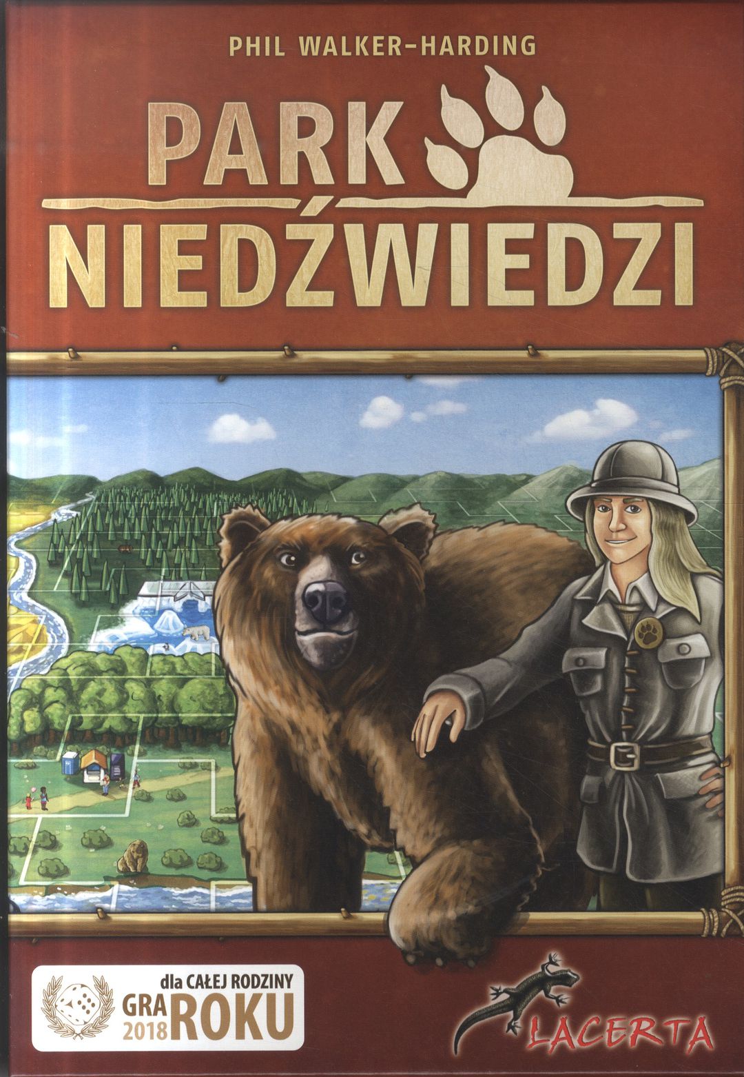 Park niedźwiedzi / Phil Walker-Harding ; tłumaczenie Przemysław Korzeniewski. - Wrocław : Lecerta, 2018. - 1 gra (plansza organizacyjna, 16 plansz terenu parku, 52 żetony terenów, 28 żetonów pawilonów, 12 żetonów wybiegów, 16 żetonów pomników niedźwiedzia, 30 żetonów osiągnięć) : karton, kolor ; w pudełku 7x27x19 cm + instrukcja (6 stron : ilustracje ; 26 cm).