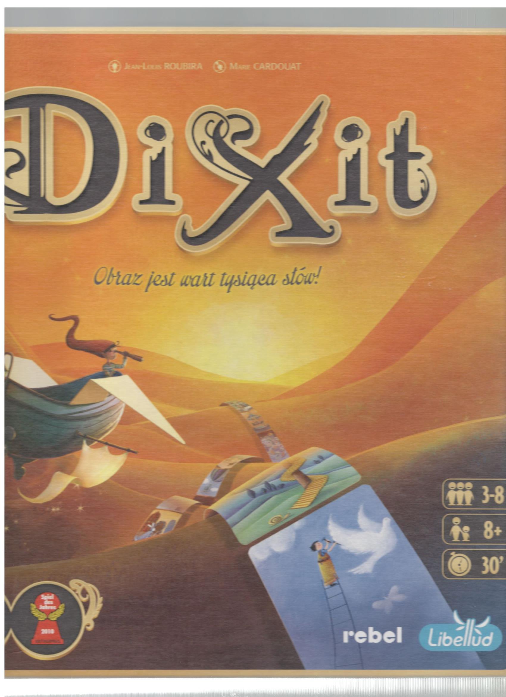 Dixit : obraz jest wart tysiąca słów / Jean-Louis Roubira ; ilustracje Marie Cardouat. - Gdańsk : Rebel, 2024. - 1 pudełko (84 karty, 8 tarcz do głosowania, 8 drewnianych króliczków, plansza, na którą składają się: tor punktacji, 8 miejsc na karty, zasady punktowania) : karton, tektura, drewno, kolor ; wymiary pudełka ; 28x28x6 cm + instrukcja.