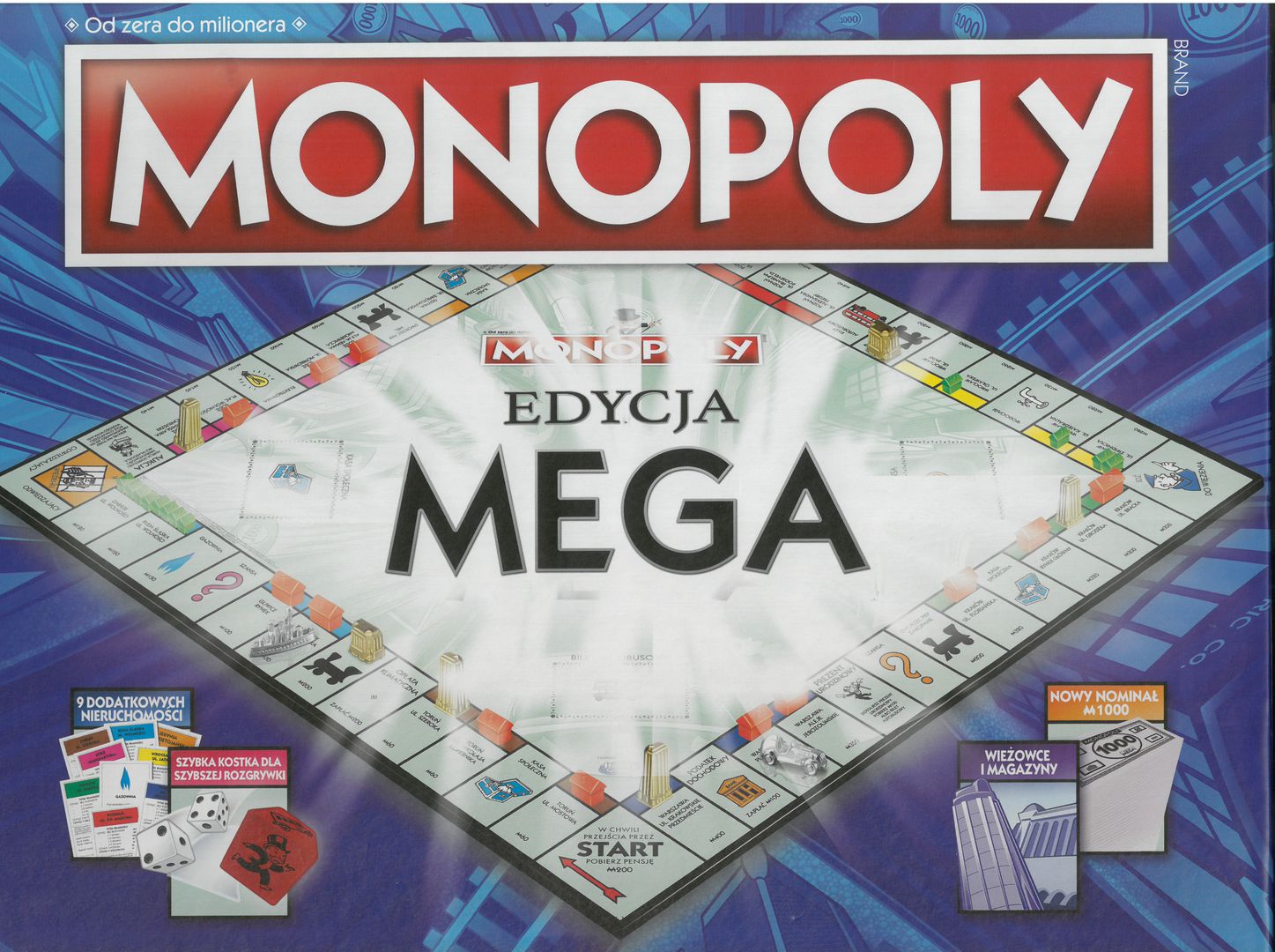 Monopoly: edycja mega. - Gdańsk : Winning Moves Polska, 2024. - 1gra ( 1 plansza, 8 pionków, wypraska na banknoty,1 plik banknotów Monopoly, 32 domy, 8 wieżowców, 4 magazyny, 12 hoteli, 2 zwykłe kostki, 1 kostka szybka, 37 kart tytuł własności, 16 kart Szansa, 16 kart kasa społeczna, 16 kart bilet autobusowy, instrukcja) : karton, tektura, metal, plastik, kolor ; w pudełku 40x33x6 cm + instrukcja