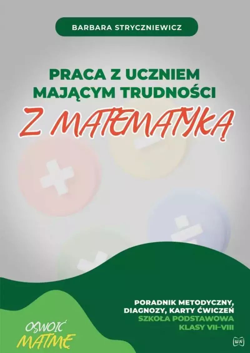 W prezentowanej książce Autorka starała się przedstawić sposób pracy z uczniami klas VII i VIII szkoły podstawowej na zajęciach zespołu wyrównawczego z matematyki. Propozycje te można wykorzystać również podczas lekcji (karty pracy jako zadania dodatkowe dla uczniów uzyskujących niższe wyniki nauczania). Materiały zawarte w książce pomogą zorganizować pracę nauczyciela z uczniami mającymi trudności w uczeniu się matematyki. W książce znajdują się: sprawdziany wstępne w klasach VII–VIII, sprawdziany – badania wyników po okresie I semestru w każdej klasie, kartkówki kontrolne do każdej klasy, karty analizy sprawdzianów wstępnych i badania wyników po I semestrze oraz kartkówek, karty ćwiczeń oznaczone np. K1, K2 itp., odpowiedzi do sprawdzianów i kartkówek.