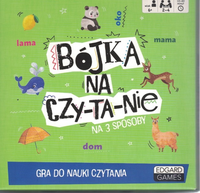 Bójka na czytanie : gra do nauki czytania / opracowanie i redakcja Ewa Norman, Ewa Lesszczyńska. - Warszawa : Wydawnictwo Edgard, 2020. - 1 gra (93 karty) : karton, papier, kolor ; w pudełku 16x16,5x4,5 cm + instrukcja .